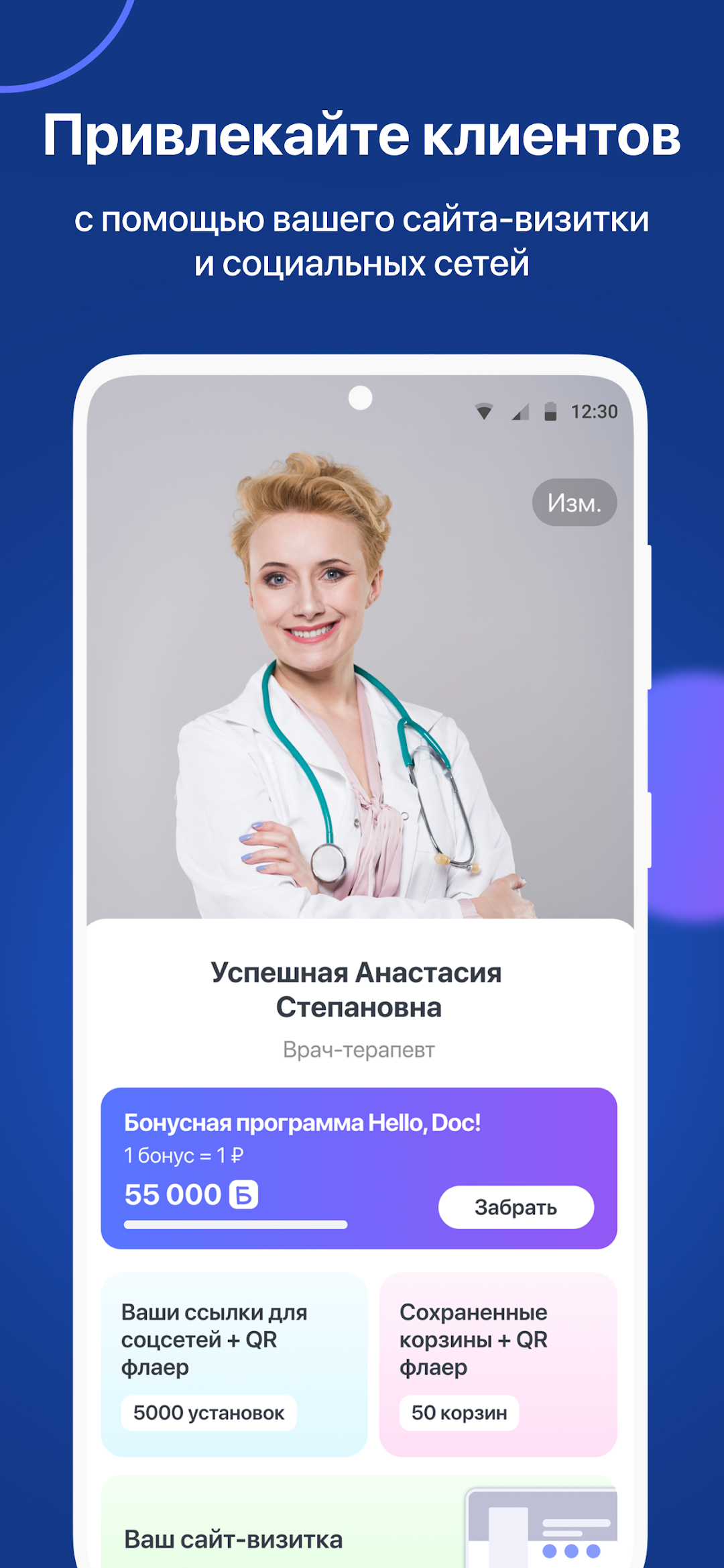Удобный инструмент для профессионала в сфере здоровья. Корпоративные программы аптек, производителей БАД и лабораторий для вас и ваших клиентов, возможность создать авторский чекап, бесплатно запустить свой сайт-визитку, общаться с клиентами в медицинском мессенджере и удобно привлекать их из социальных сетей.Создайте собственный сайт-визитку за 10 минут абсолютно бесплатно. Указывайте ваши контакты в мессенджерах, записывайте видео приветствие, вносите описание услуг с возможностью интерактивного заказа, публикуйте ссылки на ваши каналы в соц. сетях и размещайте полезные файлы и ваши авторские программы здоровья, созданные в приложении. Более 50 разных шаблонов от нашей команды дизайнеров.