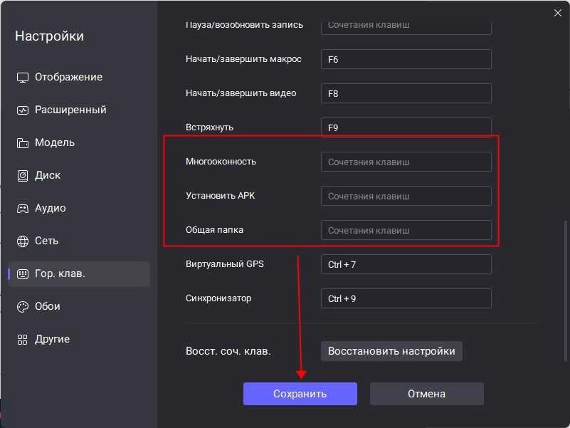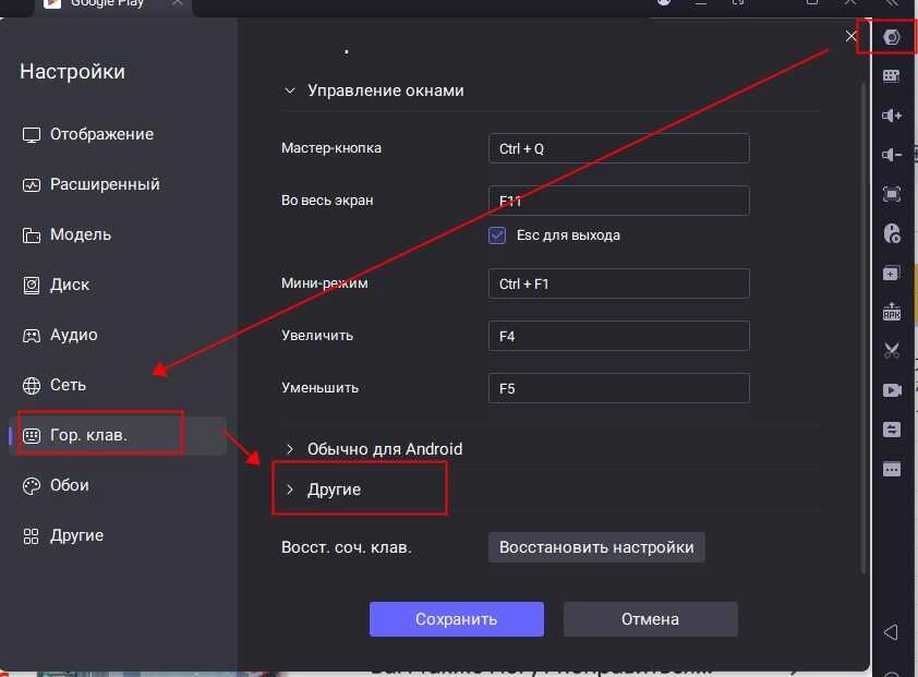 Шаг 1. Откройте параметры эмулятора и перейдите в "Гор. клавиши" - "другие"