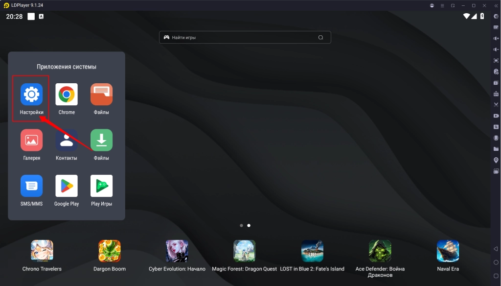 1. Откройте папку "Приложения системы" на рабочем столе эмулятора и нажмите "Настройки".
